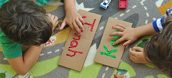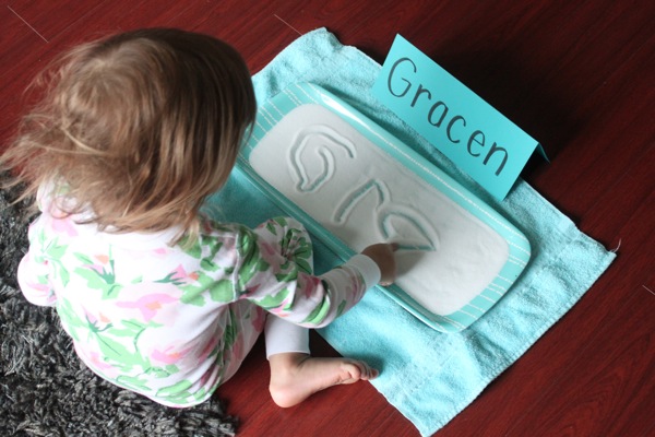 Γεμίστε έναν δίσκο με αλάτι, στερεώστε πάνω του ένα χαρτί με το όνομα του παιδιού και ζητήστε του να το σχηματίσει με τα δάχτυλά του.