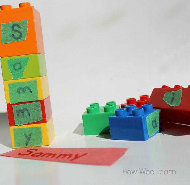 Σε αυτοκόλλητα post it σχηματίστε τα γράμματα που απαρτίζουν το όνομά του και κολλήστε τα πάνω στα lego. Το παιδί θα πρέπει να τα βάλει στη σωστή σειρά.