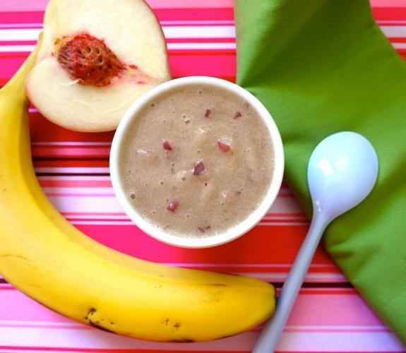 Κόψτε το ροδάκινο και το μήλο και στη συνέχεια βάλτε τα σε ένα σκεύος στο οποίο θα προσθέσετε 1/2 φλιτζάνι νερό. Αφήστε τα φρούτα να σιγοβράσουν μέχρι να μαλακώσουν και να λιώνουν εύκολα με το πιρούνι. Προσθέστε στο μίγμα τη μπανάνα και μεταφέρετε τα φρούτα στο μπλέντερ μέχρι να αποκτήσουν την υφή που θέλετε.