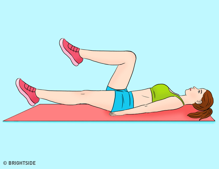 Πώς να το κάνετε: παραμένετε ξαπλωμένη και στη συνέχεια λυγίστε τα πόδια σας έτσι ώστε οι γάμπες σας να είναι παράλληλες προς το πάτωμα. Μετά, τεντώστε το δεξί πόδι και σιγά σιγά αρχίστε να το λυγίζετε κάνοντας κυκλικές κινήσεις- σαν να κάνατε ποδήλατο. Επαναλάβετε με το αριστερό πόδι.