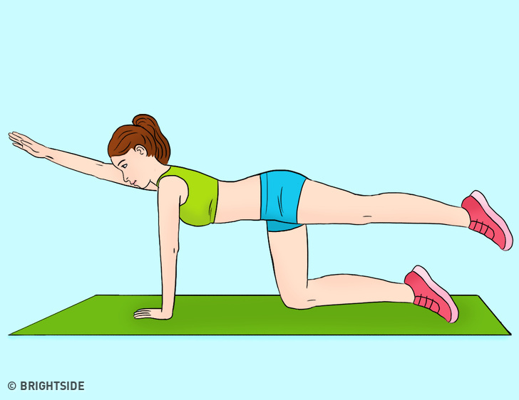 Πώς να το κάνετε: ξαπλώστε στα 4 και σιγά σιγά αρχίστε να ανεβάζετε το αριστερό σας πόδι παράλληλα στο πάτωμα. Ταυτόχρονα, τεντώστε μπροστά το δεξί σας χέρι και στη συνέχεια μετακινήστε αριστερό πόδι και δεξί χέρι προς το πλάι. Παραμείνετε σ’ αυτή τη στάση για 3 δευτερόλεπτα και μετά επιστρέψετε στην αρχική σας θέση. Επαναλάβετε το ίδιο με το δεξί χέρι και το αριστερό πόδι. Το σημαντικό είναι να κρατάτε ίσια την πλάτη σας. Το βίντεο αυτό θα σας βοηθήσει.