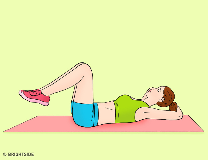 Πώς να τα κάνετε: λυγίστε τα πόδια, βάλτε τα χέρια στο κεφάλι και σιγά σιγά αρχίστε να σηκώνετε τα γόνατα προς τους ώμους. Δείτε αναλυτικά την άσκηση εδώ: