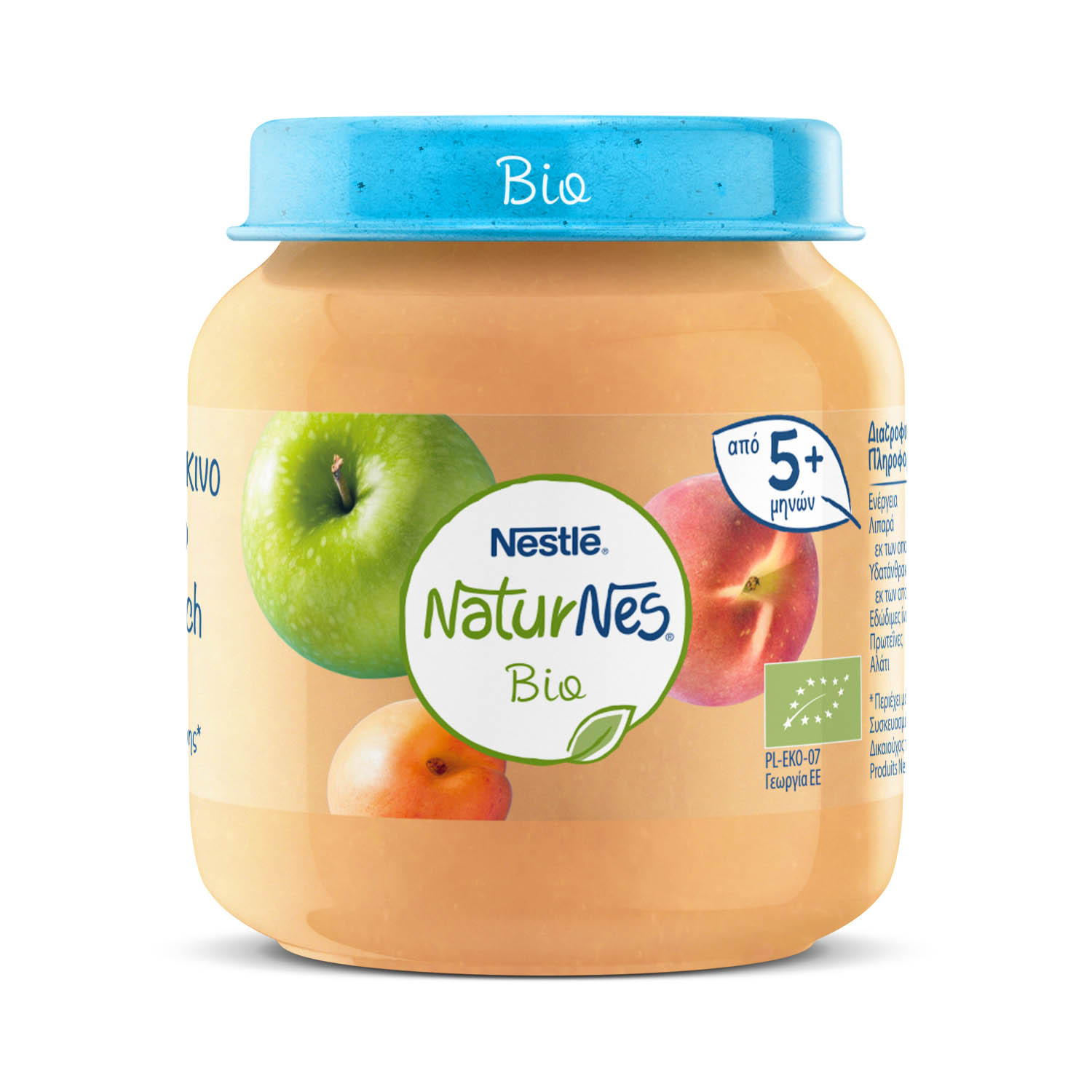 Τα έτοιμα βιολογικά βρεφικά γεύματα NaturNes Bio, κατάλληλα από τον 5ο μήνα, προέρχονται από 100% βιολογικά φρούτα και 100% βιολογικά λαχανικά, ειδικά επιλεγμένα για βρέφη, μαγειρεμένα στον ατμό, διατηρώντας, έτσι, όλα τα θρεπτικά συστατικά τους. Μέσα σε κενό αέρος και με τον πιο ασφαλή τρόπο, η Nestlé έχει «κλείσει» τα καλύτερα βιολογικά φρούτα (μήλα, ροδάκινα βερίκοκα, μπανάνες, αχλάδια), και έχει δημιουργήσει θρεπτικά γεύματα χωρίς καμία προσθήκη ζάχαρης ή συντηρητικά, όπως άλλωστε ορίζει και η νομοθεσία, διατηρώντας αναλλοίωτες τις θρεπτικές ιδιότητές τους.