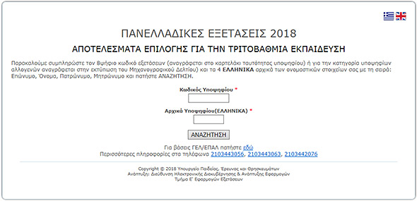 Η διαδικασία είναι απλή: μπαίνετε στην ηλεκτρονική σελίδα του Υπουργείου Παιδείας και προσθέτετε τον κωδικό του υποψηφίου στο πάνω κενό και τα αρχικά του υποψηφίου στο κάτω κενό. Στη συνέχεια πατάτε «Αναζήτηση».