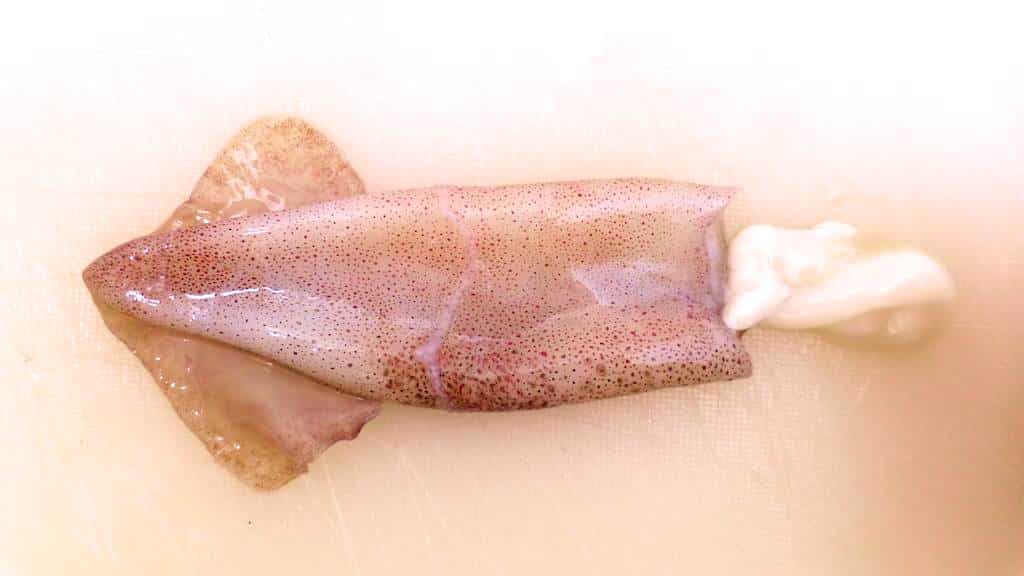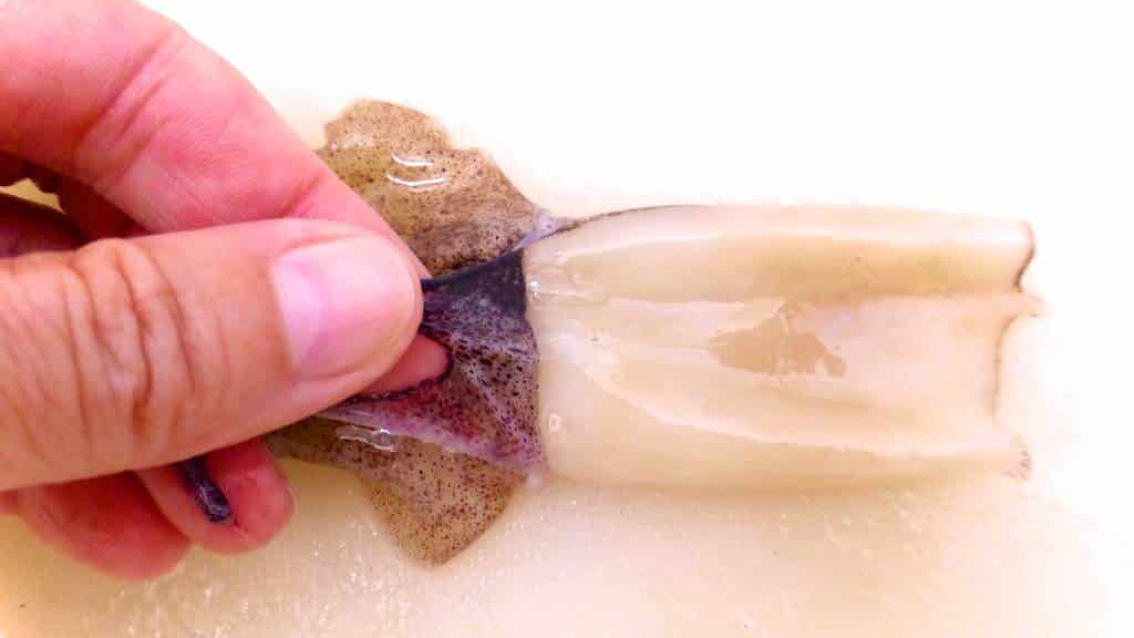 Αφαιρέστε το δέρμα του καλαμαριού, πιάνοντάς το με τα χέρια και τραβώντας το προς τα πτερύγια, όπως βλέπετε στη φωτογραφία. Επαναλάβετε το ίδιο και για το δέρμα των πτερυγίων. Η σάρκα του πρέπει να έχει λευκό ή ανοιχτό κίτρινο χρώμα.