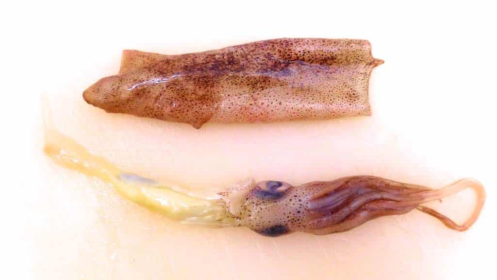 Εκείνο το μικρό μαύρο εξόγκωμα που βλέπετε στη φωτογραφία είναι το στόμα του καλαμαριού. Βεβαιωθείτε ότι δεν έχει μείνει κανένα υπόλειμμά του και στη συνέχεια πετάξτε το κομμάτι με τα μάτια και την άσπρη γλίτσα.