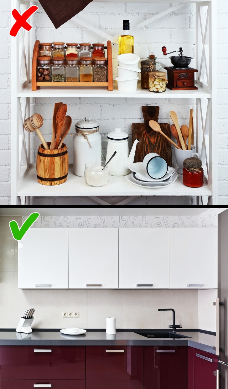 Είναι η εύκολη λύση γιατί έχετε μπροστά σας ό,τι χρειάζεστε την ώρα που ετοιμάζετε το φαγητό, όμως, όταν όλα τα σύνεργα της μαγειρικής είναι μαζεμένα έτσι, κάνουν την κουζίνα να φαίνεται ακατάστατη. Προτιμήστε να κρατήσετε έξω μόνο ό,τι χρειάζεστε και αποθηκεύστε όλα τα υπόλοιπα στα ντουλάπια.