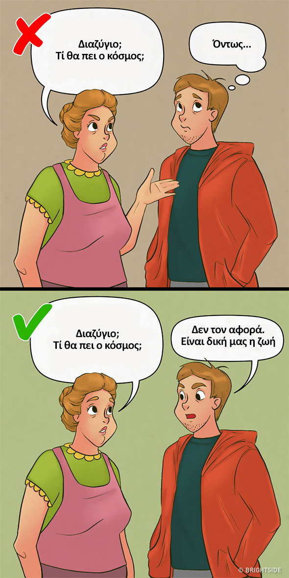 Συχνά ένας γάμος στηρίζεται μόνο στο φόβο της κοινωνικής κατακραυγής στην περίπτωση ενός διαζυγίου. Το «tι θα πει ο κόσμος» και η πίεση του άμεσου οικογενειακού περιβάλλοντος, μπαίνουν εμπόδιο στην ευτυχία δύο ανθρώπων, όταν αυτή υπαγορεύεται από ξεχωριστές ζωές. Ωστόσο, αυτός που τελικά υποφέρει δεν είναι ούτε ο κόσμος, ούτε τα πεθερικά… Πάρτε τη ζωή και το γάμο στα χέρια σας και αποφασίστε το καλύτερο για εσάς χωρίς τη συμμετοχή των άλλων!