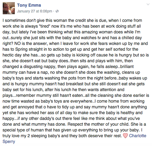 Όταν φεύγω για δουλειά, πρέπει να ξυπνήσει και να ανασυγκροτηθεί για τη δύσκολη μέρα που την περιμένει… Όταν ξυπνάει, το μωρό κλαίει και κλωτσάει επειδή πεινάει. Και η ίδια πεινάει. Το μωρό τρώει, εκείνη όχι. Μετά παίζει μαζί του, το αλλάζει, ξαναπαίζουν κι έπειτα το μωρό κοιμάται. Κάποια άλλη ίσως το εκμεταλλευόταν και έπαιρνε κι εκείνη έναν υπνάκο, αλλά όχι η αυτή η μαμά. Εκείνη βάζει μπουγάδα, μαζεύει τα παιχνίδια, πλένει τα πιάτα μέχρι που το μωρό ξυπνάει πάλι πεινασμένο. Η μαμά δεν έχει φάει ακόμα πρωινό, αλλά ετοιμάζει το μεσημεριανό του μωρού και το ταΐζει. Έπειτα περνάει χρόνο μαζί του και παίζουν. Θυμηθείτε, η μαμά δεν έχει φάει ακόμα… Όλο το μάζεμα που είχε κάνει όσο το μωρό κοιμόταν πάει χαμένο, αφού τα παιχνίδια είναι πάλι σκορπισμένα παντού. Επιστρέφω από τη δουλειά και νευριάζω με την ακαταστασία. Την κατηγορώ πως όλη μέρα καθόταν και δεν έκανε τίποτα αλλά έκανε το πιο σημαντικό απ’ όλα: όλη μέρα φρόντιζε το μωρό να είναι υγιές και χαρούμενο. Αν σκέφτεται κανείς άλλος μπαμπάς σαν κι εμένα, ας αναλογιστεί τι έχει προσφέρει εκείνος και τι η μαμά του σπιτιού… Να σέβεστε τη μητέρα του παιδιού σας. Είναι μια ξεχωριστή κατηγορία ανθρώπου που δίνει ολόκληρο τον εαυτό της για να μεγαλώσει τα παιδιά σας. Αγαπώ πραγματικά τα δύο μωρά μου που κοιμούνται και αξίζουν και τα δύο λίγη ξεκούραση.»