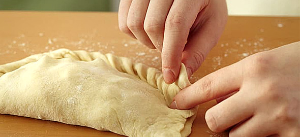 Βάλτε τη γέμιση του μπολ στα φύλλα της ζύμης και σκεπάστε από την μία πλευρά. Στη συνέχεια, πιέστε και κλείστε τις άκρες με ένα πιρούνι, όπως φαίνεται στη φωτογραφία. Με ένα πινέλο, περάστε την κορυφή των καλτσόνε με γάλα και πασπαλίστε από πάνω με την τριμμένη παρμεζάνα.