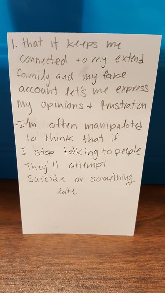 «Αυτό που δεν ξέρουν οι γονείς μου για τα social media, είναι ότι με κρατάνε ενωμένο με την πραγματική μου οικογένεια και με τον ψεύτικο λογαριασμό μου εκφράζω την πραγματική μου άποψη και τον εκνευρισμό μου. Συχνά σκέφτομαι πως εάν σταματούσα να μιλάω σε κάποιους ανθρώπους, αυτοί, ίσως, αυτοκτονούσαν.».