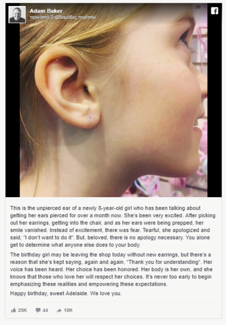 «Αυτό είναι το αυτί ενός 8χρονου κοριτσιού που ζητούσε επίμονα να τρυπήσει τα αυτιά του πάνω από έναν μήνα. Ήταν πολύ ενθουσιασμένη με αυτή της την απόφαση. Αφού διάλεξε τα σκουλαρίκια της, κάθισε στην καρέκλα και λίγο πριν το μηχάνημα τρυπήσει το αυτί της, το χαμόγελο ενθουσιασμού εξαφανίστηκε. Αντί για ενθουσιασμός υπήρχε φόβος. Δυστυχώς, ζήτησε συγνώμη και είπε: "Δε θέλω να το κάνω". Αγαπημένη μου, δεν υπάρχει κανένας λόγος να ζητάς συγνώμη. Μόνο εσύ μπορείς να αποφασίσεις τι θα κάνεις με το σώμα σου.