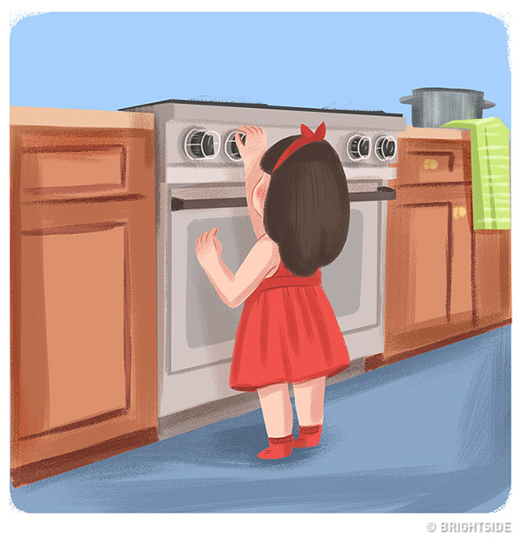 Από τα μάτια της κουζίνας, τα μαχαίρια που είναι σε κοινή θέα, μέχρι και το ψυγείο που (χαίρονται να) ανοιγοκλείνουν όλη την ώρα, τα περισσότερα (αν όχι όλα) αντικείμενα που βρίσκονται στην κουζίνα, είναι επικίνδυνα. Για να είστε σίγουροι ότι το παιδί δεν θα κοπεί-καεί, τοποθετήστε ειδικό προστατευτικό στον φούρνο, κρύψτε όλα τα αιχμηρά αντικείμενα και μην ξεχάσετε να βάλετε σε ψηλό ράφι τις πλαστικές σακούλες και τις μεμβράνες. Ο κίνδυνος να βάλουν την μεμβράνη στο στόμα τους ή να φορέσουν στο κεφάλι τους τη σακούλα, μπορεί να οδηγήσει σε πνιγμό και ασφυξία.
