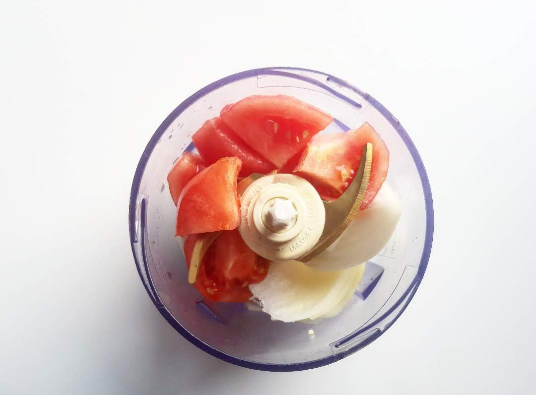 Στη συνέχεια, σε ένα μούλτι προσθέτετε το σκόρδο, την ντομάτα και το κρεμμύδι. Πολτοποιείτε τα υλικά και μαζί με τα δαφνόφυλλα τα προσθέτετε στην σούπα και τα ανακατεύετε.