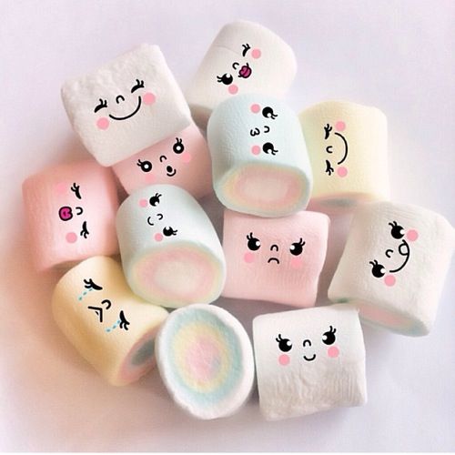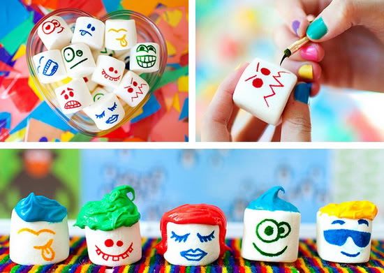 Πάρτε λευκά marshmallow και ζωγραφίστε διάφορες φατσούλες με χρώμα ζαχαροπλαστικής.