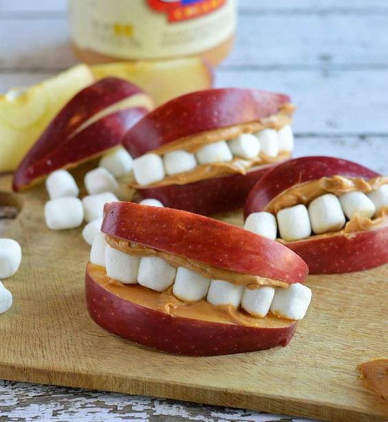 Κόψτε το μήλο σε τέσσερα ίσια κομμάτια με τη φλούδα (αφού την έχετε σαπουνίσει καλά). Αλείψτε την μέσα πλευρά των κομματιών με φυστικοβούτυρο και ενώστε με marshmallow όπως στη φωτογραφία.