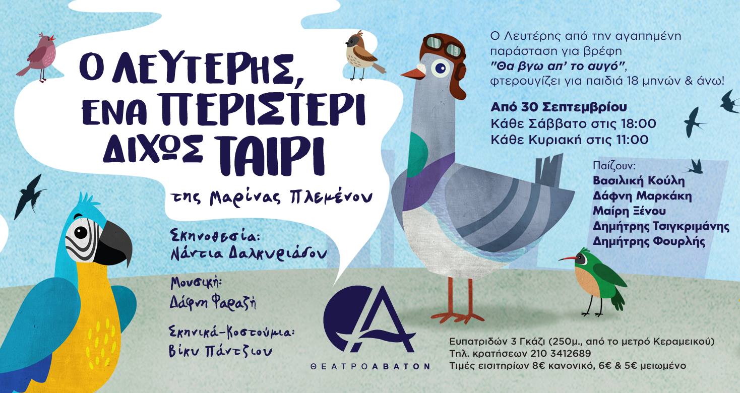 Καλά καταλάβατε! Το περιστέρι, ο Λευτέρης είναι το ίδιο περιστέρι που βγήκε απ’ το αυγό του στο θέατρο Άβατον. Η συγκεκριμένη παράσταση, λοιπόν, απευθύνεται σε λίγο μεγαλύτερα παιδιά από 18 μηνών (γι’ αυτό και διαρκεί 70 λεπτά) , που γίνονται συνταξιδιώτες στις περιπέτειες του Λευτέρη και τους περνάει τα μηνύματα της αλληλεγγύης, του σεβασμού και της διαφορετικότητας.