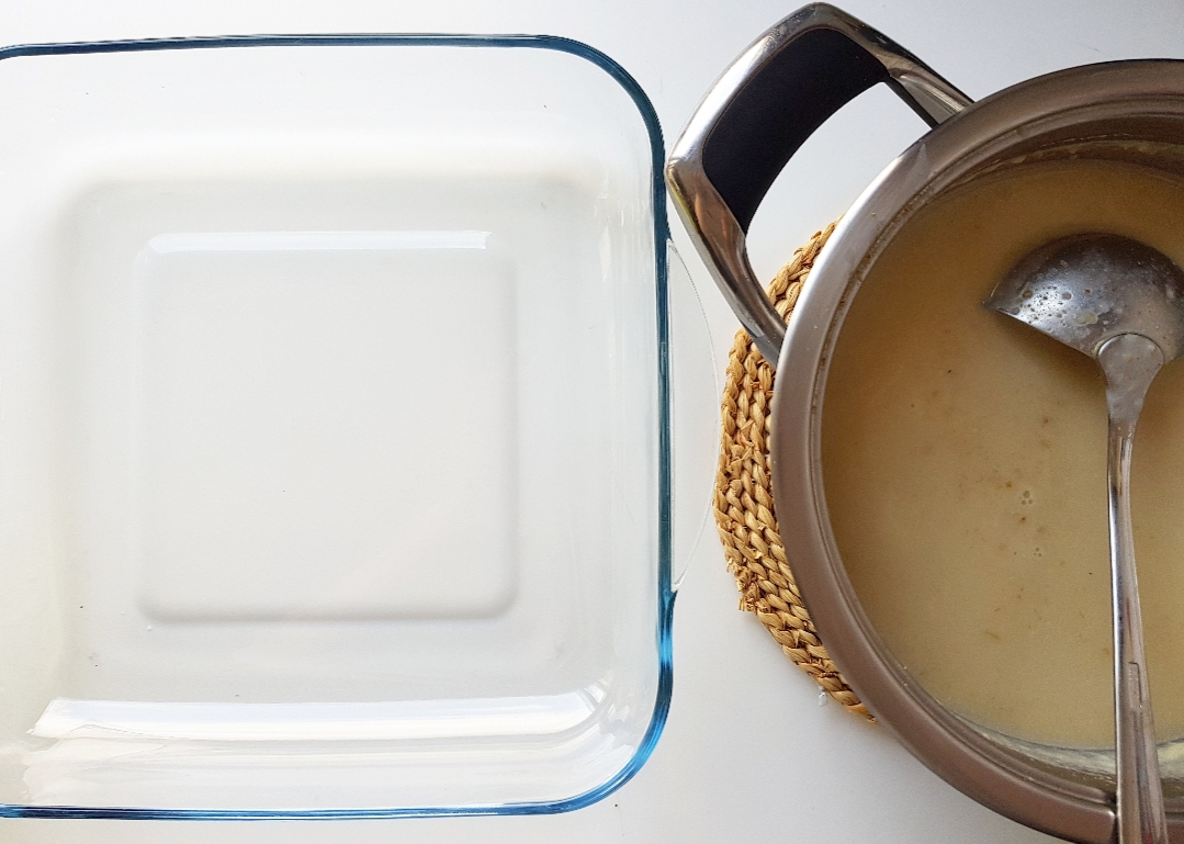 Τον αφαιρείτε από την φωτιά και τον βάζετε σε ένα πυρέξ ή βαθύ ταψάκι. Ενδεικτικά, το σκεύος της φωτογραφίας έχει διαστάσεις 20x25.