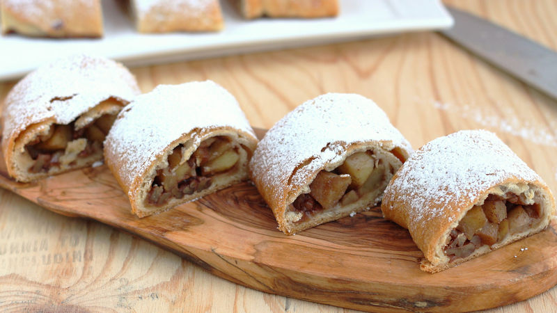 Έπειτα αλείψτε την με το υπόλοιπο λιωμένο βούτυρο (ή με λάδι), βάλτε τη γέμιση μέσα και τυλίξτε την σε ρολό. Αν θέλετε, μπορείτε να κάνετε λίγες σχισμές με το μαχαίρι για να πάρει το στρούντελ το κλασικό του σχέδιο.
