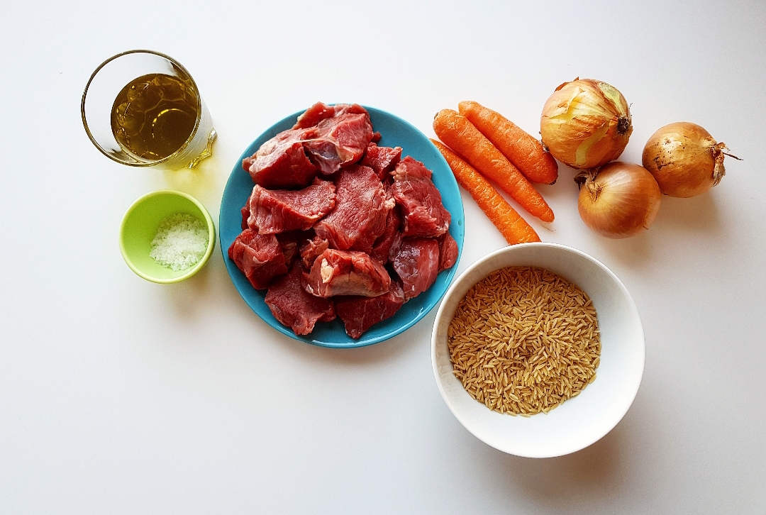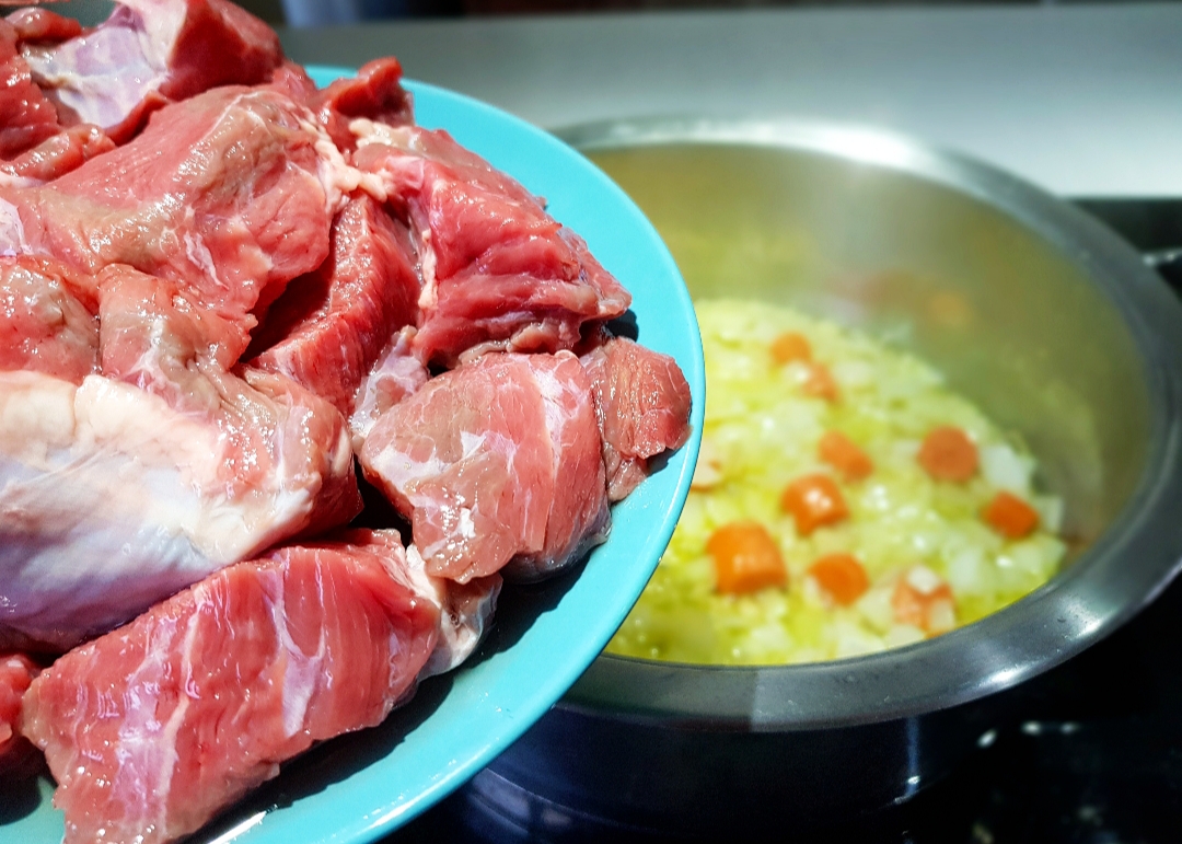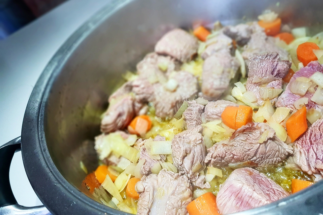 Ξεπλένετε καλά το μοσχάρι και το τσιγαρίζετε για πέντε, περίπου, λεπτά μαζί με τα λαχανικά.