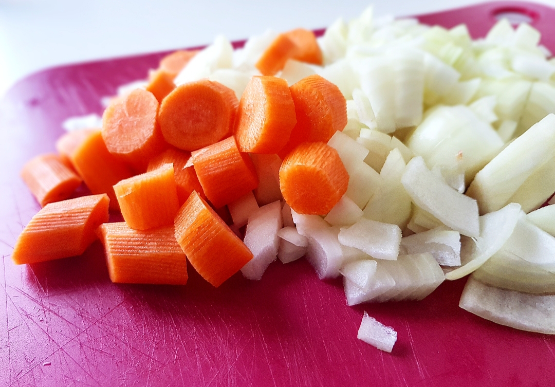 Κόβετε σε χοντρά κομμάτια τα κρεμμύδια και τα καρότα.