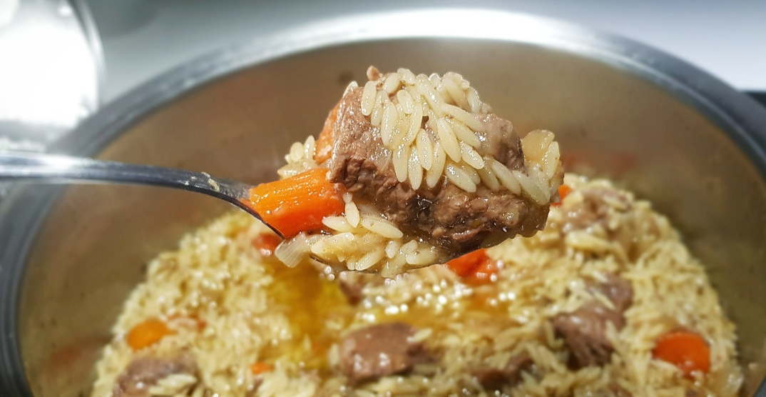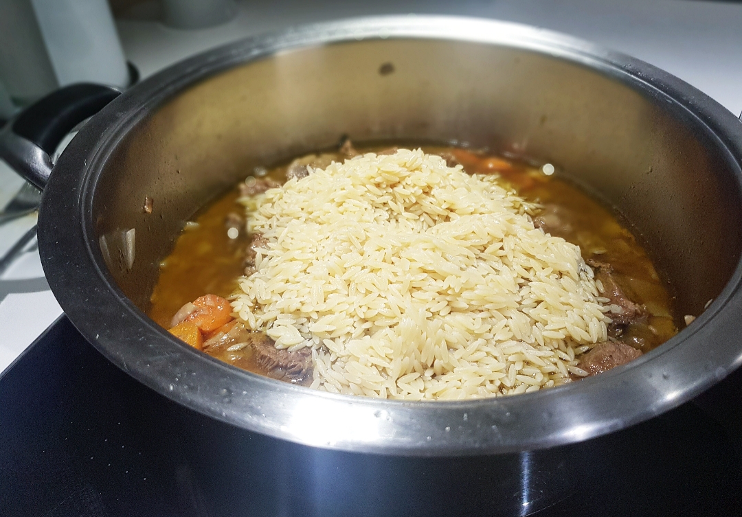 Όσο σιγοβράζει το κρέας, φτιάχνετε το κριθαράκι. Βράζετε μπόλικο αλατισμένο νερό σε μία κατσαρόλα και μόλις αρχίσει να κοχλάζει, ρίχνετε το κριθαράκι για 5 λεπτά. Έπειτα το ξεπλένετε και το αφήνετε στην άκρη.