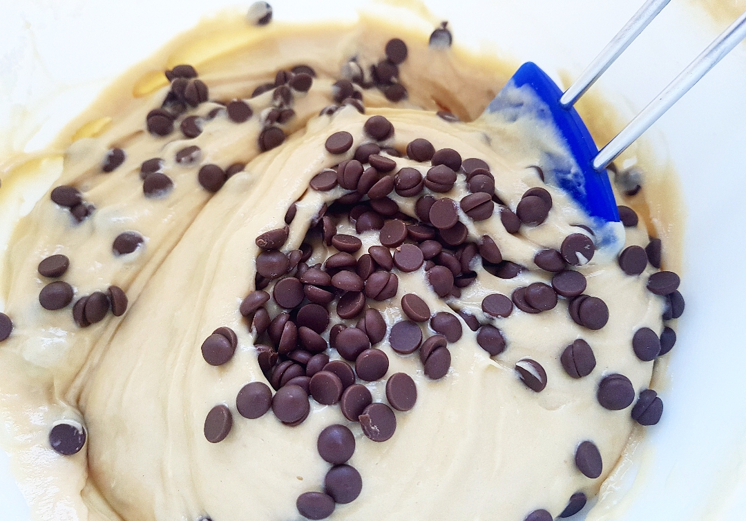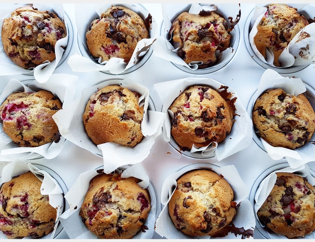 Έπειτα, με μια μαρίζ, βάζετε απαλά τα raspberries και την κουβερτούρα στο μείγμα.
