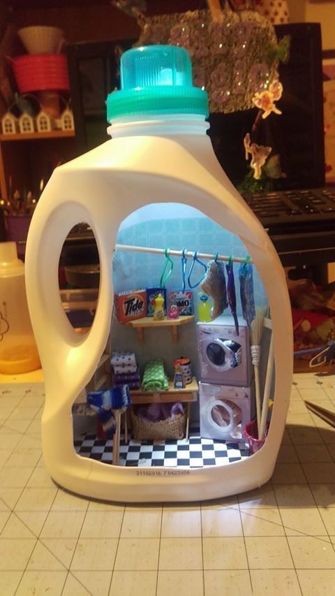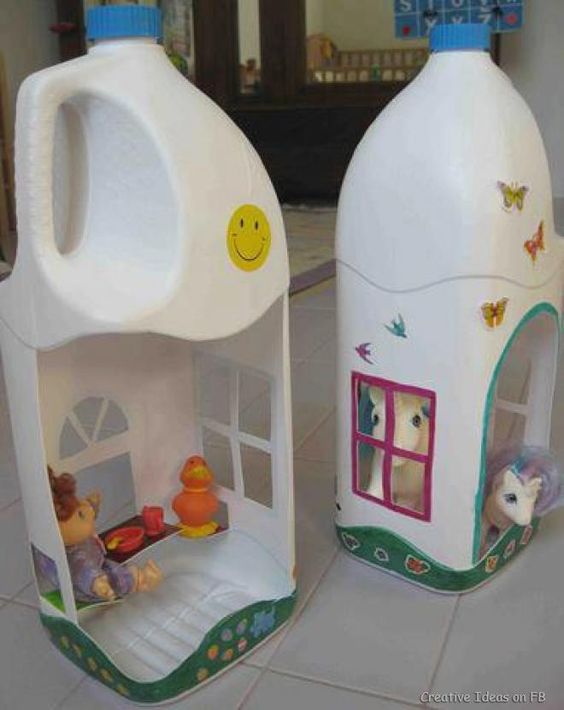 Χρησιμοποιήστε μια άδεια, πλαστική συσκευασία από απορρυπαντικό, και ξεπλύνετέ την πολύ καλά. Σχεδιάστε στην κεντρική όψη την είσοδο και κόψτε την με ένα κοπίδι. Με τον ίδιο τρόπο, μπορείτε να κατασκευάσετε παράθυρα. Από κει και πέρα, μπορείτε να το βάψετε, να ζωγραφίσετε ή να κολλήσετε διάφορα σχέδια και να φτιάξετε ένα υπέροχο κουκλόσπιτο – σπιτάκι.