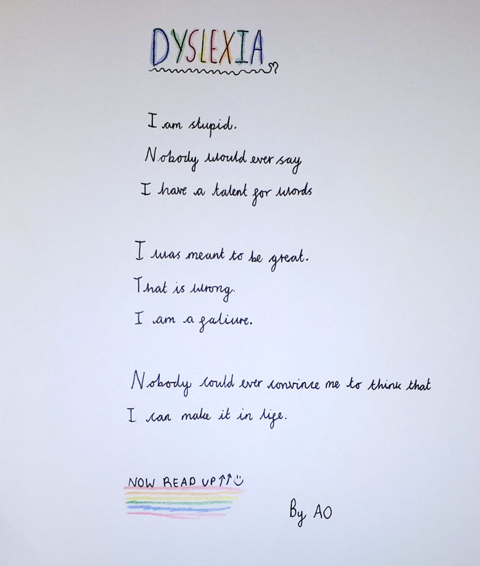 «Δυστυχώς, πολύ συχνά τα παιδιά με δυσλεξία δυσκολεύονται στο σχολείο και νομίζουν πως δεν μπορούν να κάνουν όσα και τα υπόλοιπα παιδιά» συμπληρώνει η καθηγήτρια του κοριτσιού.