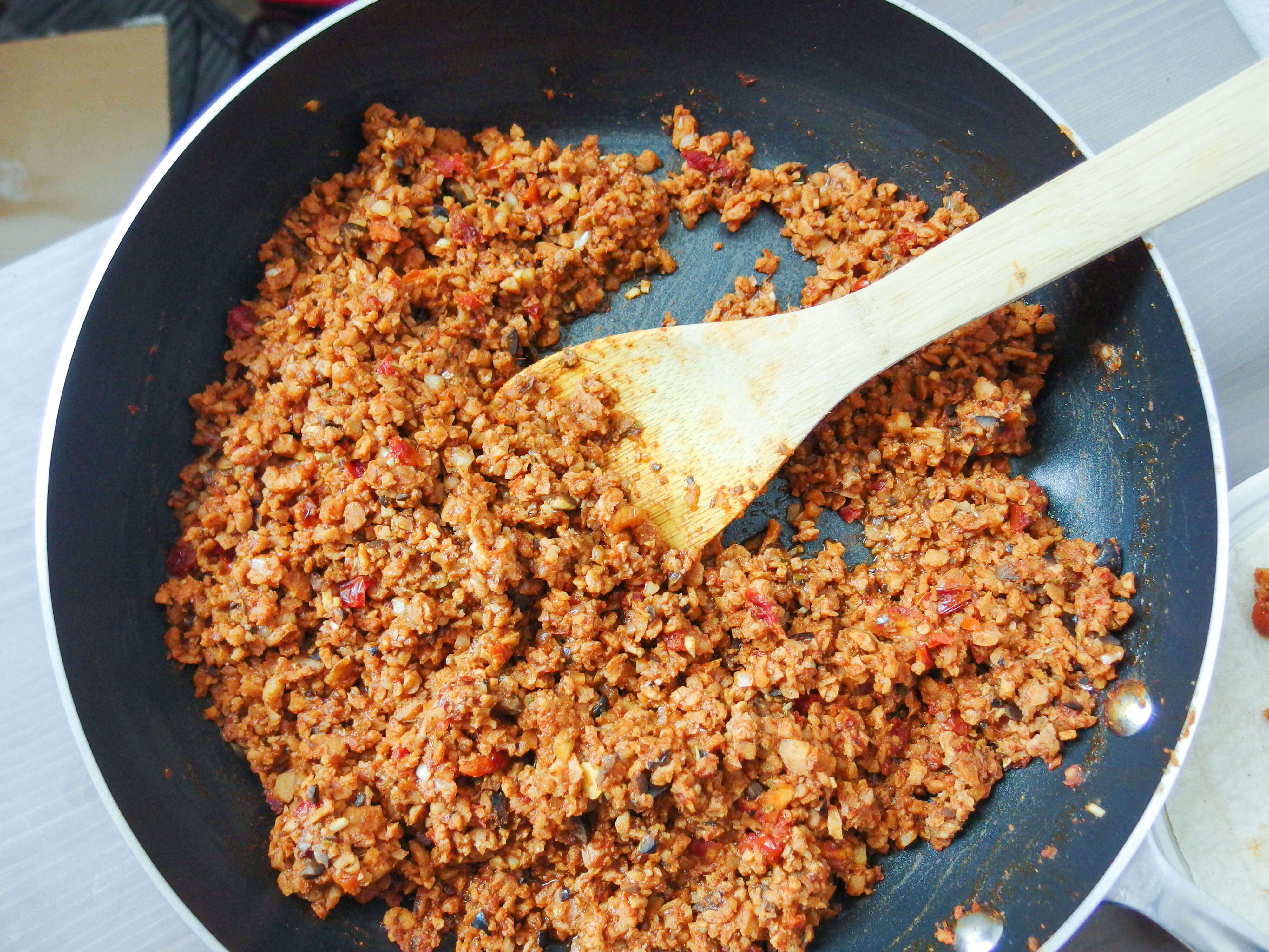 Μεταφέρετε τον κιμά σόγιας σε ένα αρκετά μεγάλο σκεύος και προσθέστε τα ψιλοκομμένα τοματάκια ή την πασάτα. Αφήνετε τη σάλτσα να «δέσει» σε μεσαία φωτιά χωρίς να βράσει και ανακατεύετε τακτικά.