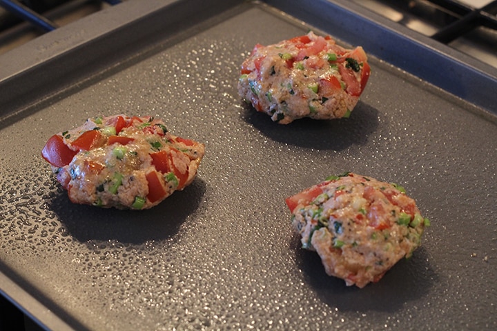 Σε περίπτωση που δεν νηστεύετε το τυρί, μπορείτε να προσθέσετε στις ντομάτες και τα κρεμμύδια 114 γραμμάρια θρυμματισμένη φέτα. Έπειτα, ρίχνετε το αλεύρι και το αλατοπίπερο και ζυμώνετε καλά τα υλικά μέχρι να ομογενοποιηθούν. Πλάθετε το μείγμα σαν να φτιάχνετε κεφτέδες.