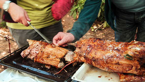 Πριν ράψετε την κοιλιά, βάλτε στο εσωτερικό της μερικά κλωναράκια θυμάρι και δενδρολίβανο που θα αρωματίσουν το κρέας και θα δώσουν ακόμα πιο πλούσια γεύση.