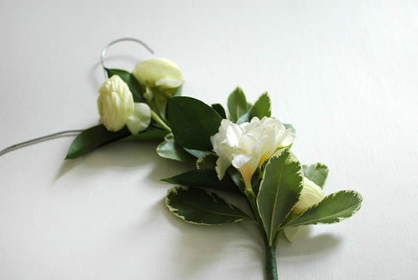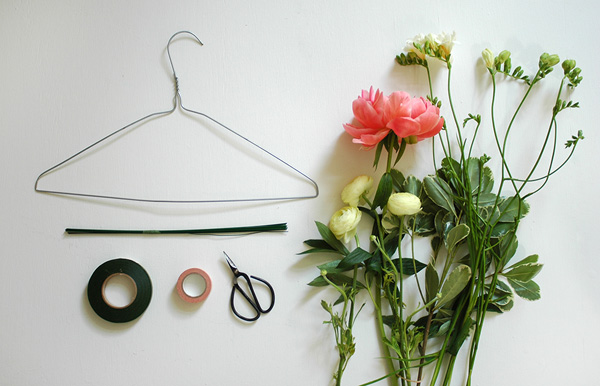 Συγκεντρώστε ανθισμένα κλαδάκια και μικρά λουλούδια με κοτσάνι, τα οποία θα δένετε ανά ματσάκια είτε με κλωστή είτε με λεπτό λαστιχάκι γύρω από το σύρμα, μέχρι να το καλύψετε εντελώς.