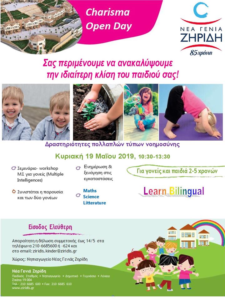 Το Open Day θα πραγματοποιηθεί από τις 10.30 το πρωί μέχρι τις 13.30 το μεσημέρι. Θα πραγματοποιηθεί ειδικό σεμινάριο για γονείς σχετικά με τους πολλαπλούς τύπους νοημοσύνης των παιδιών ενώ θα έχουν την ευκαιρία να ξεναγηθούν στις εγκαταστάσεις των εκπαιδευτηρίων.