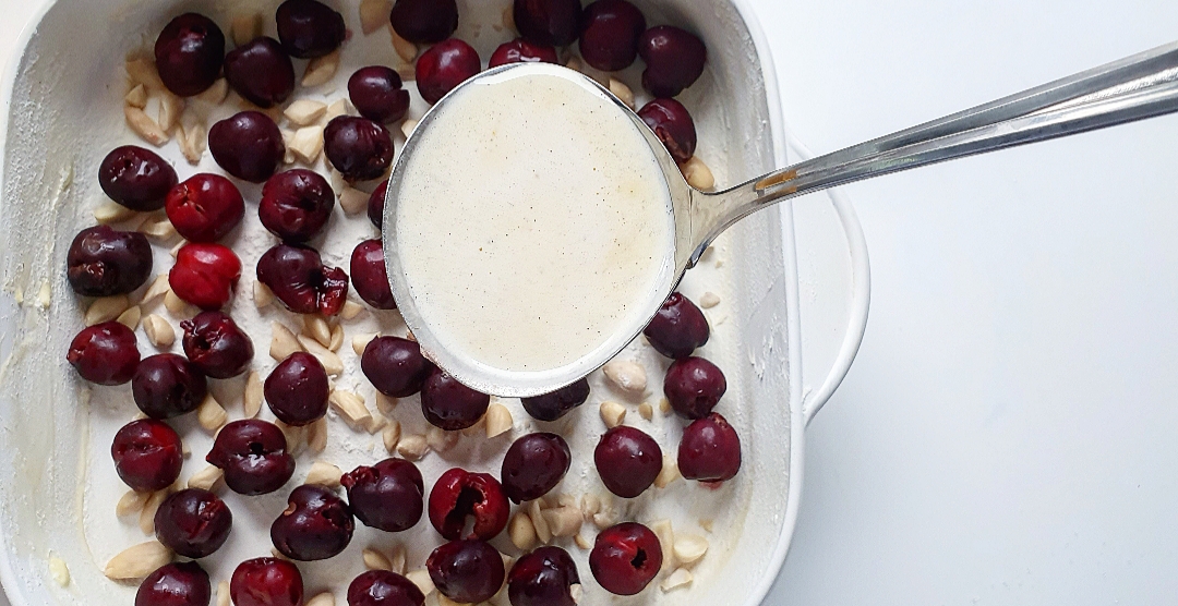 Ρίχνετε το μείγμα στο πυρέξ πάνω από τα κεράσια και ψήνετε στον φούρνο στους 180 βαθμούς στον αέρα για 35 λεπτά.
