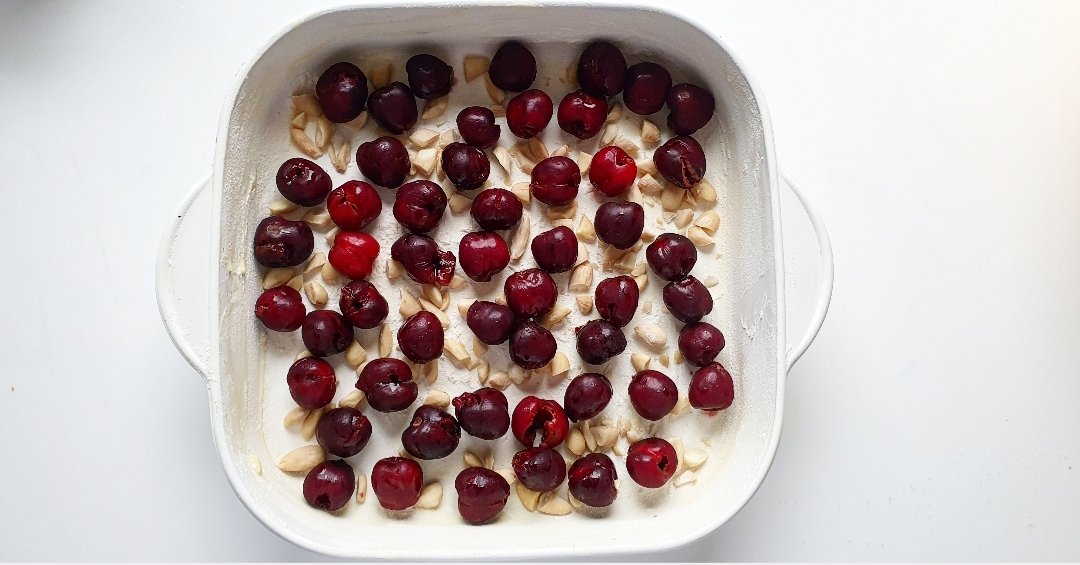 Αφού βουτυρώσετε και αλευρώσετε ένα πυρέξ, ρίξτε τα κεράσια και προσθέστε τα αποφλοιωμένα αμύγδαλα.