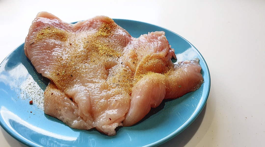 Καρυκεύετε το στήθος κοτόπουλο με μπαχαρικά όπως αλατοπίπερο και πάπρικα.