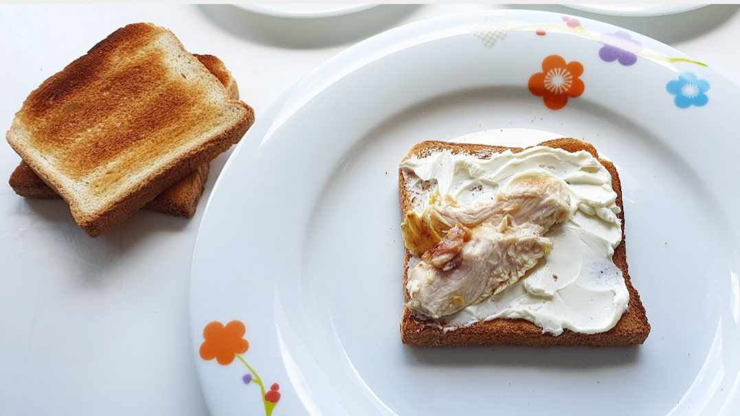 Στο πρώτο ψωμάκι απλώνετε 1 κουταλάκι του γλυκού τυρί κρέμα. Πάνω από αυτό βάζετε λίγο κοτόπουλο. Στην συνέχεια, παίρνετε τη δεύτερη φέτα ψωμιού, την αλείφετε με μαγιονέζα και την τοποθετείτε με την μαγιονέζα πάνω από το κοτόπουλο.