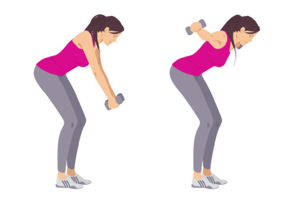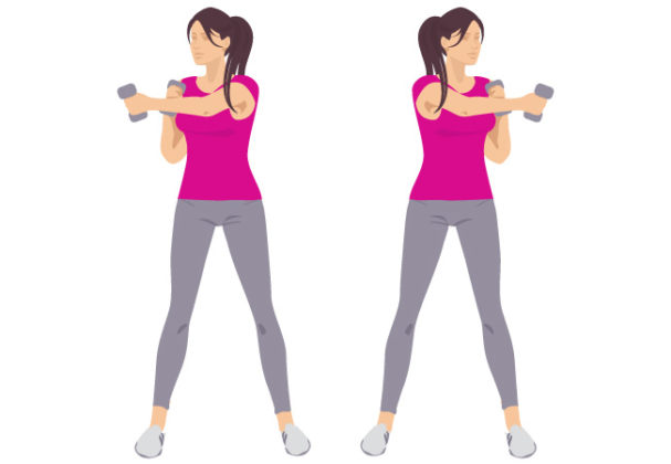 Σταθείτε όρθιες με ελαφρώς λυγισμένα τα γόνατα και κρατώντας δύο βαράκια στα χέρια. Σκύψτε προς τα εμπρός ενώ σπρώχνετε προς τα πίσω τους γοφούς. Αφήστε τα χέρια να πέσουν προς το έδαφος. Με μία κίνηση εκτείνετε τα χέρια προσέχοντας να είναι στην ίδια ευθεία με τους ώμους. Επιστρέψτε στην αρχική σας θέση και επαναλάβετε για 20 δευτερόλεπτα.
