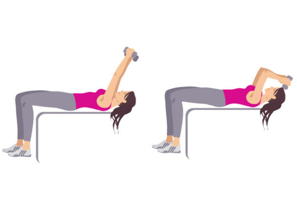 Ξαπλώστε ανάσκελα σε έναν πάγκο παίρνοντας από ένα βαράκι σε κάθε χέρι. Κρατήστε τα χέρια τεντωμένα πάνω από το κεφάλι προσέχοντας οι παλάμες να κοιτάζουν η μία την άλλη. Λυγίστε τους αγκώνες μέχρι οι καρποί σας να φτάσουν στο πλάι του κεφαλιού, φροντίζοντας να μην κινείτε καθόλου τα μπράτσα, . Επιστρέψτε αργά στην αρχική σας θέση και επαναλάβετε για για 20 δευτερόλεπτα.