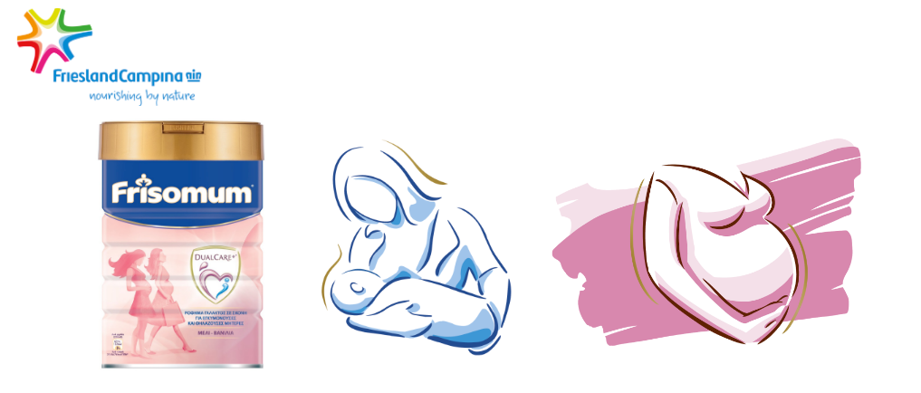 Η διατροφή μας πρέπει να είναι ισορροπημένη και να περιλαμβάνει απαραίτητα θρεπτικά συστατικά όπως: Μαγνήσιο, Σίδηρο, Φολικό οξύ, Βιταμίνες C, D και B, Ασβέστιο και Ιώδιο. Εκτός από φρούτα, λαχανικά ή άπαχο κρέας, καλό είναι να πίνετε αρκετό γάλα. Το Frisomum DualCare+ από την FrieselandCampina είναι ένα νέο καινοτόμο προϊόν ειδικά σχεδιασμένο για εγκυμονούσες και θηλάζουσες μητέρες. Πρόκειται για ένα ρόφημα γάλακτος σε σκόνη το οποίο, με 2 ποτήρια των 200ml, καλύπτει σε σημαντικό βαθμό τα παραπάνω θρεπτικά συστατικά προετοιμάζοντας τον οργανισμό σας να ανταπεξέλθει στην ιδιαίτερη περίοδο της εγκυμοσύνης και του θηλασμού όπου οι ανάγκες είναι αυξημένες.