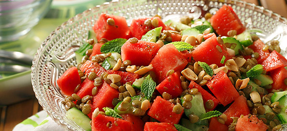 - Βάλτε σε μία σαλατιέρα τους κύβους καρπουζιού χωρίς τα κουκούτσια, τις φακές αφού έχουν κρυώσει και τη μισή φέτα. Αν θέλετε προσθέστε και τα φύλλα μέντας.