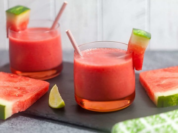 - Σ’ ένα μπλέντερ βάλτε τα κομμάτια καρπουζιού και το νερό. Αφού τα «χτυπήσετε» προσθέστε το μέλι ή τα φύλλα μέντας και συνεχίστε το ανακάτεμα για 10 λεπτά ακόμη. Σερβίρετε παγωμένο.