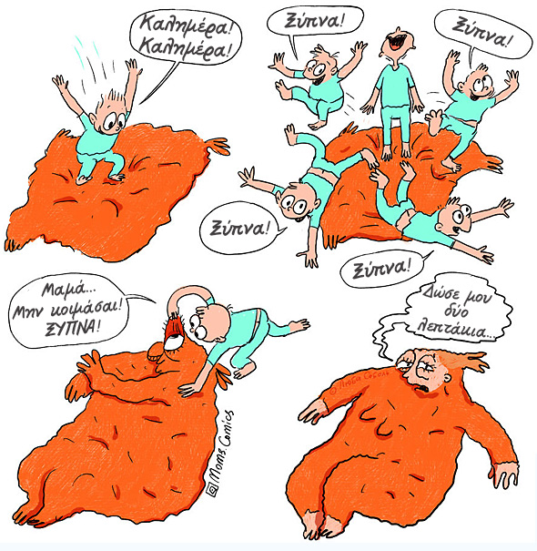 Τα νήπια έχουν αστείρευτη ενέργεια...ειδικά τα πρωινά. Εσύ από την άλλη με το ζόρι θυμίζεις ανθρώπινη ύπαρξη!