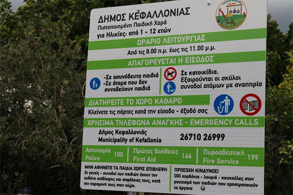 Στην είσοδο, πρέπει να υπάρχει πάντα πινακίδα με το σήμα πιστοποίησης, τις ώρες λειτουργίας και τις ηλικίες για τις οποίες προορίζεται ο συγκεκριμένος χώρος, συγκεκριμένα τηλέφωνα έκτακτης ανάγκης και τα τηλέφωνα επικοινωνίας με τη δημοτική αρχή που έχει την ευθύνη του χώρου.