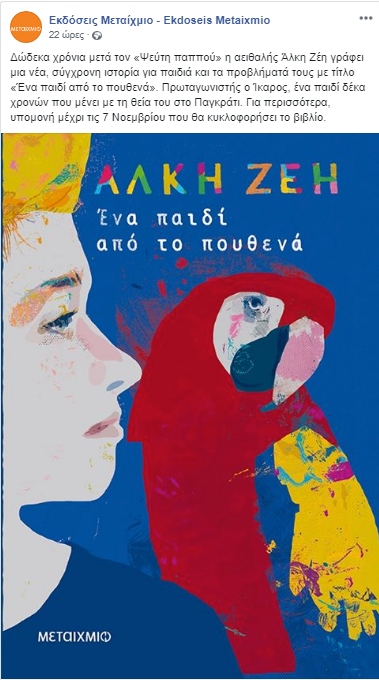 «Δώδεκα χρόνια μετά τον «Ψεύτη παππού» η αειθαλής Άλκη Ζέη γράφει μια νέα, σύγχρονη ιστορία για παιδιά και τα προβλήματά τους με τίτλο «Ένα παιδί από το πουθενά». Πρωταγωνιστής ο Ίκαρος, ένα παιδί δέκα χρονών που μένει με τη θεία του στο Παγκράτι. Για περισσότερα, υπομονή μέχρι τις 7 Νοεμβρίου που θα κυκλοφορήσει το βιβλίο.»