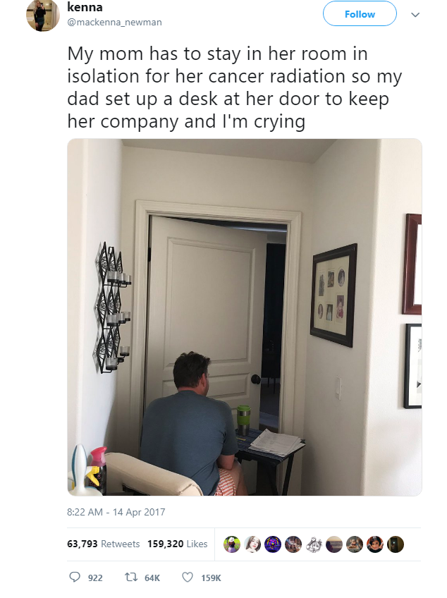 «Η μαμά πρέπει να είναι σε απομόνωση για τη χημειοθεραπεία, έτσι ο μπαμπάς μου έφτιαξε ένα γραφειάκι έξω από το δωμάτιό της για να της κάνει παρέα και εγώ κλαίω έγραψε στη λεζάντα της η 17χρονη κόρη τους.