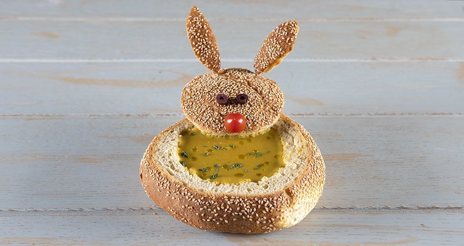 Για το σερβίρισμα, κόβετε το πάνω μέρος του καρβελιού και αφαιρείτε την ψίχα μέχρι ένα σημείο, τόσο ώστε η σούπα να μην περνάει από μέσα όταν τα γεμίσετε. Με το «καπάκι» που περίσσεψε, φτιάχνετε το κεφάλι και τ’ αυτιά ενός κουνελιού για τη διακόσμηση (στηρίζετε τ’ αυτιά με οδοντογλυφίδες). Για μάτια βάζετε ελιές και για μύτη ντοματίνια.