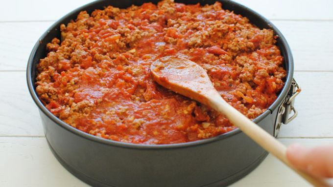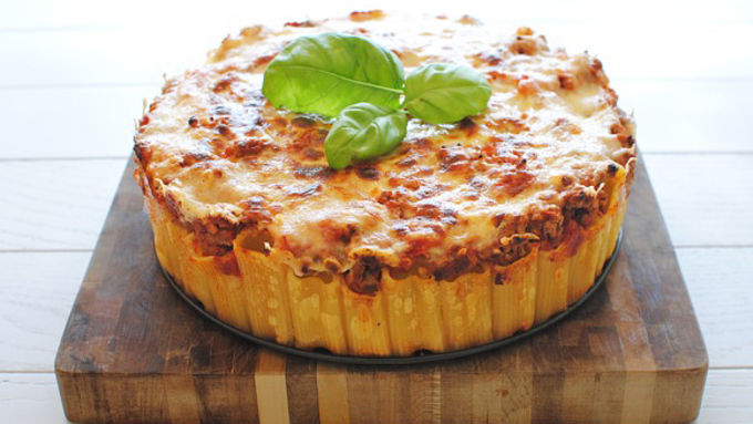 Στην συνέχεια, ρίχνετε τον κιμά πάνω στα ριγκατόνι και τα ψήνετε στον φούρνο για 15 λεπτά σε προθερμασμένο φούρνο στους βαθμούς. Στην συνέχεια, βγάζετε την πίτα, προσθέτετε την τριμμένη μοτσαρέλα και ψήνετε για 15 λεπτά ακόμα μέχρι να λιώσει το τυρί.
