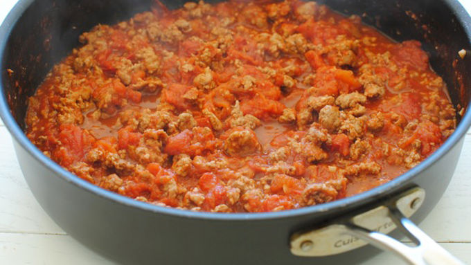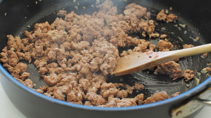 Σ’ ένα τηγάνι βάζετε ελαιόλαδο και ζεσταίνετε σε δυνατή φωτιά. Μόλις κάψει τσιγαρίζετε τον κιμά, σπάζοντάς τον παράλληλα με μία ξύλινη κουτάλα σε κομματάκια μέχρι να ροδίσει, για περίπου 5-8 λεπτά.